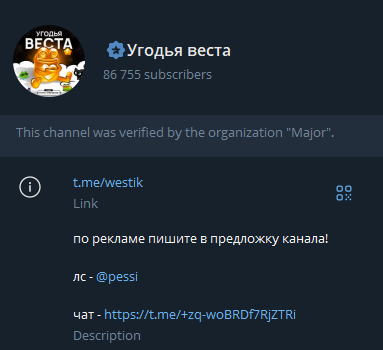 Угодья Веста — это большой Telegram-канал c криптовалютной тематикой, работающий под логином @Westik. Канал продвигается через рекламу с оплатой за подписчика — около 2–4 ₽, что явно демонстрирует платную накрутку аудитории. Также явно используются кросс‑промо — партнёрские упоминания @Pessi, @Westpf и чат‑ссылка “Угодья Веста Chat”. Рассмотрим детально работу канала и отклики других трейдеров.