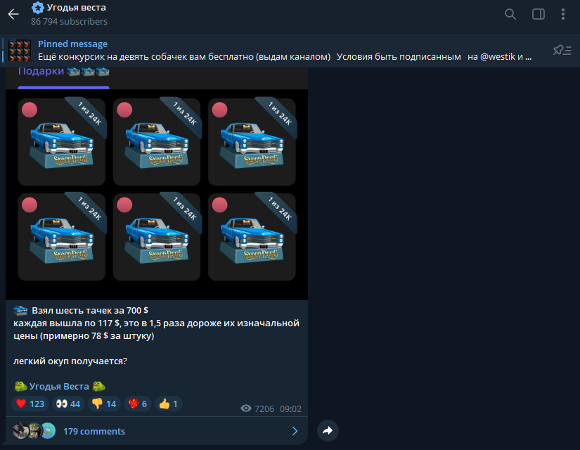 Канал использует «Autogiftsbot», через который якобы контролирует дропы: в начале июля бот был удален, вместе с ~600 000 $ средств, что стало отдельным информационным событием. Такая драма — почва для раздумия подписчиков, но за ней скрывается отсутствие прозрачности.