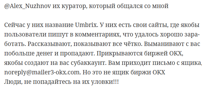 В интернете есть несколько отзывов от подписчиков ТГ-канала Umbrix, которые называют платформу скамом.