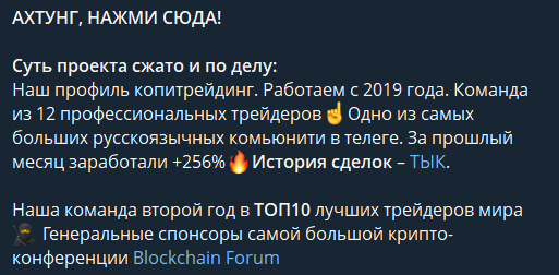 Umbrix — канал в Телеграмме, создатели которого называют себя группой из 12 прибыльных трейдеров. Они предлагают своим подписчикам услугу копитрейдинга, обещают прибыль в сотни процентов за кратчайшие сроки.