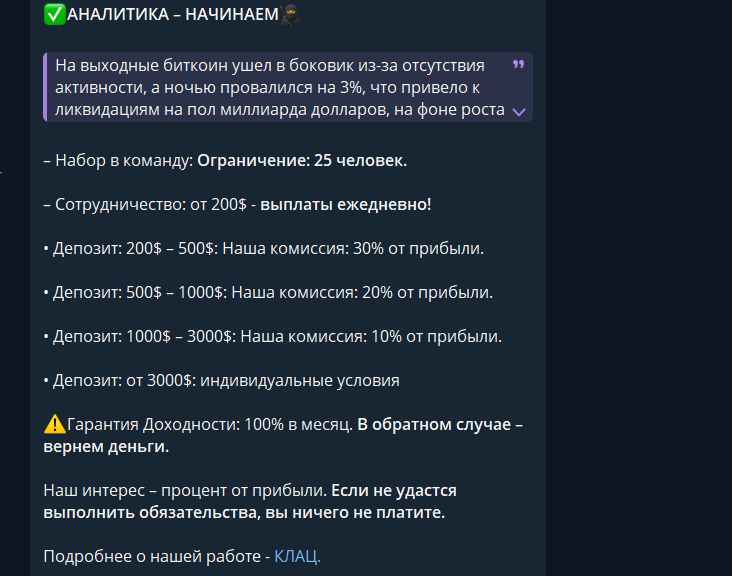 Минимально можно вложить $100, а при депозите от $3000 якобы можно рассчитывать на индивидуальные условия сотрудничества. Клиентам гарантируют доходность в 100% ежемесячно. Также у проекта есть некое закрытое сообщество с обучением трейдингу.