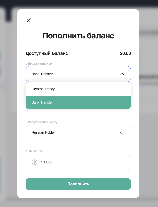 Для работы с брокером нужно внести на баланс его аккаунта депозит от 50 долларов. В системе заявлена поддержка двух платежных методов: криптовалютные кошельки и банковские переводы (не карты).
