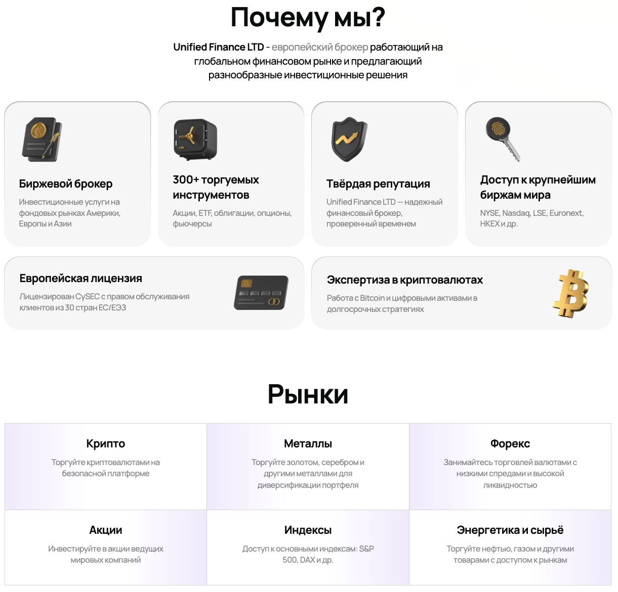 Заявлено, что на сайте my unifiedfinance ltd реализована поддержка более чем трехсот инструментов для трейдинга. Брокер предоставляет доступ к рынкам валют, цифровых финансов, индексов и др.