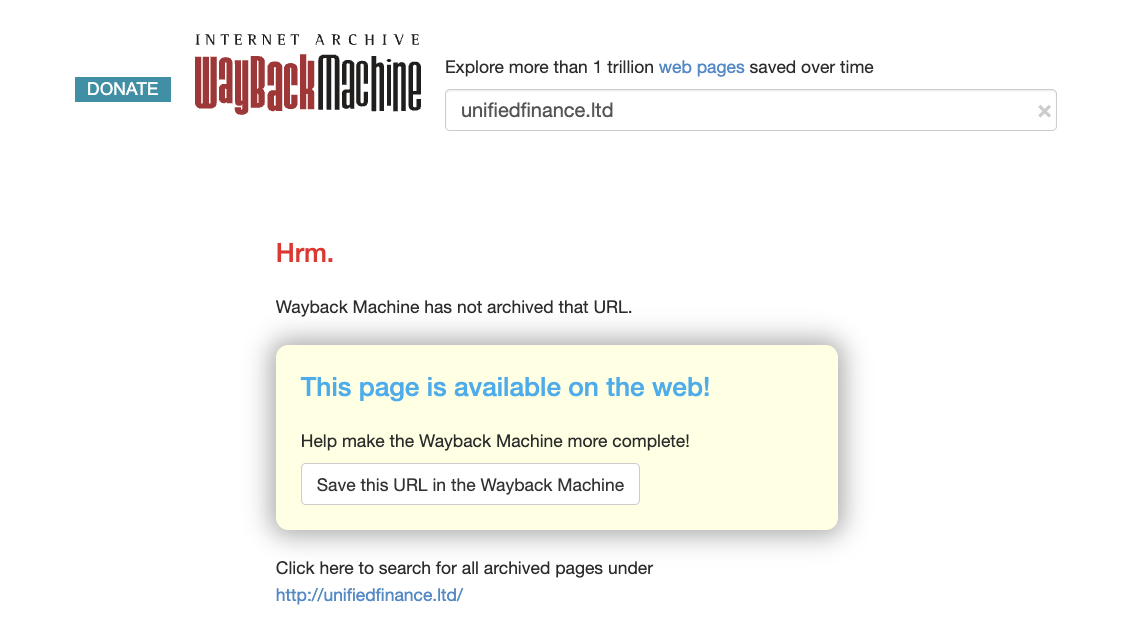Наша редакция обратилась к сервису WayBackMachine, чтобы выяснить, когда брокер начал работу. В результате мы обнаружили, что его бот не зафиксировал ни одного снимка сайта unifiedfinance ltd.