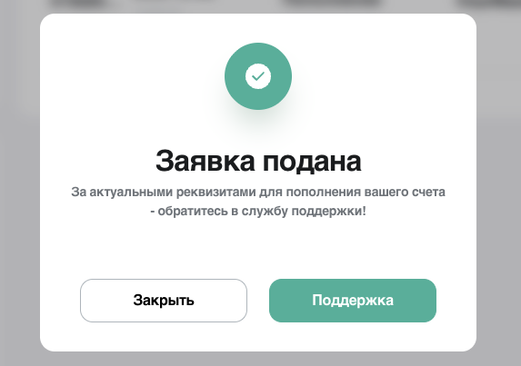 Если выбрать пополнение с банковского счета, то появится сообщение «Заявка подана». Для ее исполнения нужно связаться со службой техподдержки. Это выглядит крайне подозрительно. Настоящие брокеры обычно выдают реквизиты сразу, а не предлагают связываться с поддержкой для проведения оплаты.