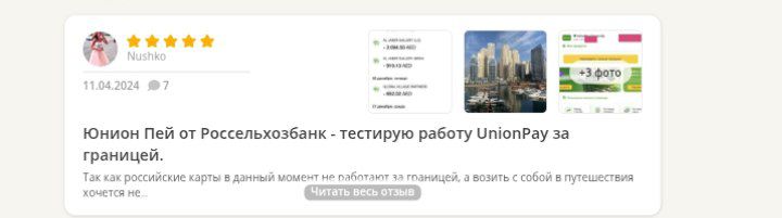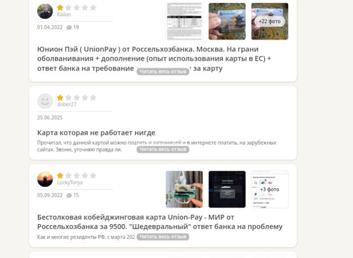 За последние два года отзывы о карте «ЮнионПей» от русскоязычных пользователей ушли в минус. Чаще всего жалуются клиенты «Россельхозбанка»: им приходят сообщения о пересчете старых операций, карта внезапно уходит в минус, а горячие линии банка и системы не берут на себя ответственность. Пользователи рассказывают, что не смогли оплатить такси в Испании, бронь отеля в ОАЭ или ужин в турецком ресторане.