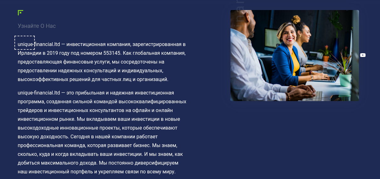 Uique Financial – якобы международная инвестиционная компания с регистрацией в Ирландии. Они предлагают нам быстрое приумножение капитала за счет неких «сложных решений» и управления портфелем. Администрация ресурса вещает о создании целой экосистемы для инвесторов, «гарантирует» безопасность сделок и стабильный профит даже во времена глобальных кризисов.