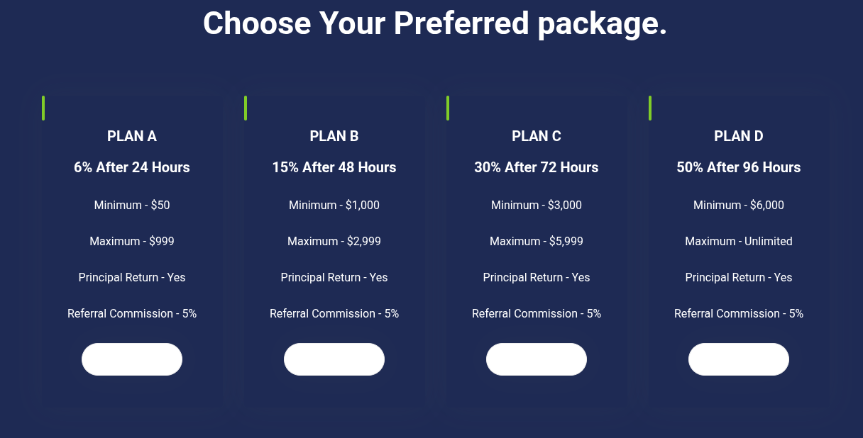 - Plan D – фантастические 50% прибыли за 96 часов при вкладе от $6000.