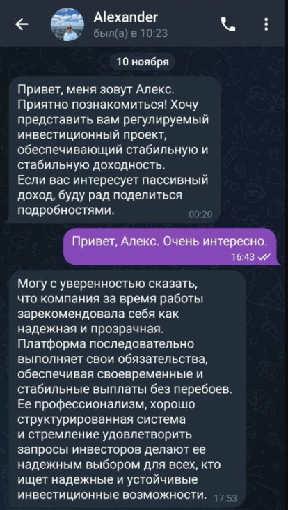 В Telegram и WhatsApp действуют зазывалы (например, персонажи под ником Alexander), которые пишут с иностранных номеров (чаще всего виртуальных) и предлагают «выгодные инвестиции». Схема обработки жертвы выглядит так:
