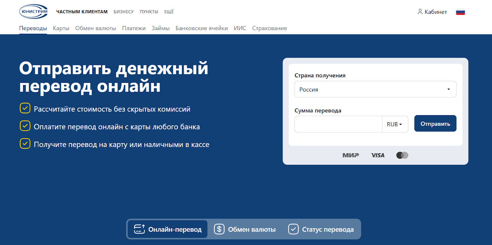 Переводы и обмены средств через «Юнистрим» возможны в двух форматах: офлайн и онлайн. В первом случае пользователь обращается в любой пункт банка и отправляет перевод другому человеку по России, в страны СНГ или за границу. Получатель обращается в ближайший пункт сервиса и получает средства наличными. Ту же самую операцию можно произвести и онлайн, на сайте или в приложении.