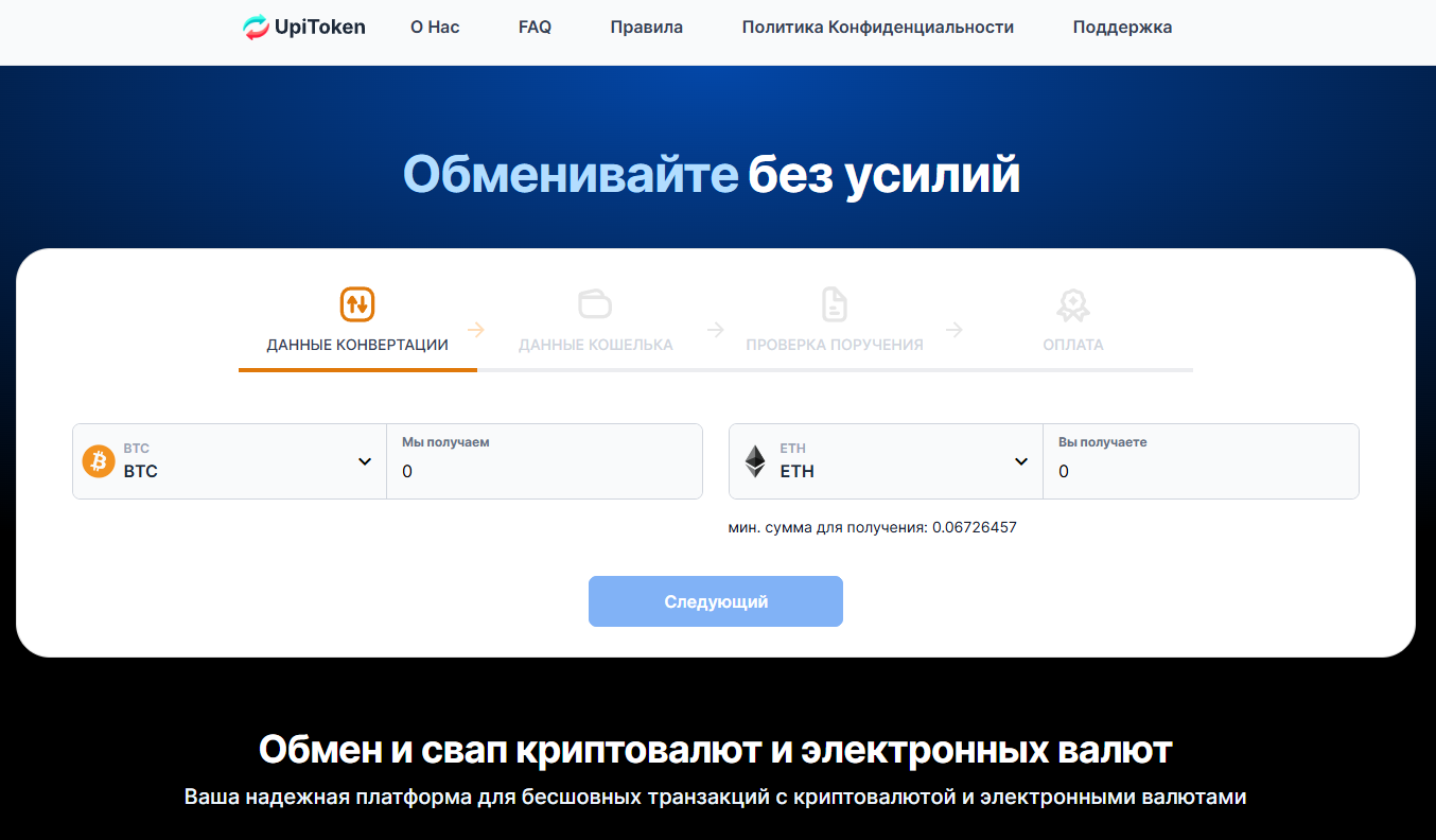 На сайте UpiToken com обменник описан как онлайн-платформа для обмена криптовалют и цифровых валют. Команда начала работу восемь лет назад с обмена электронных денег PayPal и WebMoney, а потом расширилась на криптовалюты.