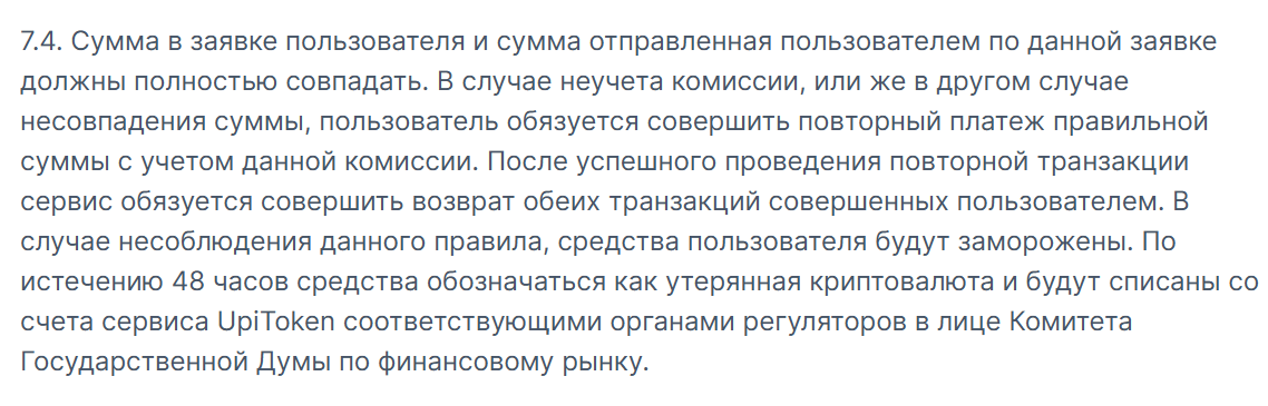 Пункт 7.4 описывает ситуацию с отправкой неправильной суммы: средства замораживают и требуют повторный платеж, а через 48 часов деньги «списываются органами регуляторов в лице Комитета Государственной Думы».