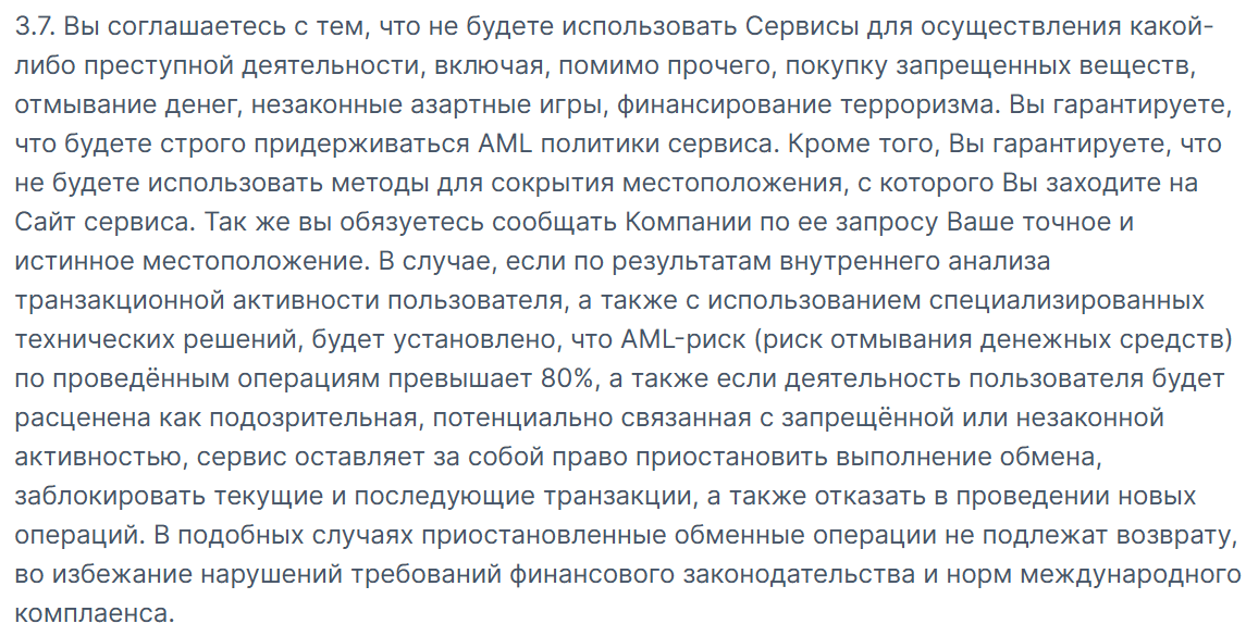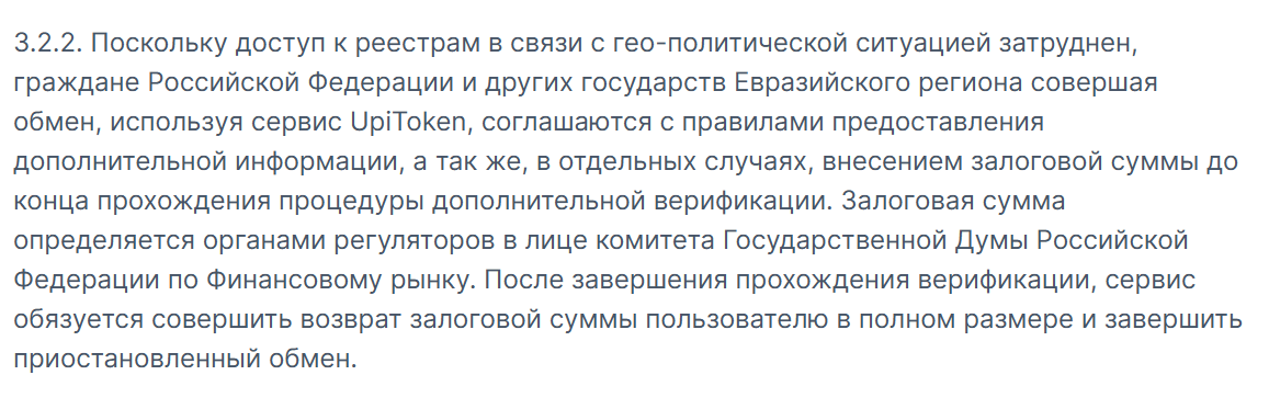 Самые тревожные пункты скрыты в пользовательском соглашении. Пункт 3.2.2 обязывает граждан России вносить залоговую сумму для прохождения дополнительной верификации «из-за геополитической ситуации». В тексте написано, что размер залога определяет Комитет Государственной Думы по финансовому рынку, но этот комитет не регулирует крипто-обменники и не устанавливает никакие залоги.
