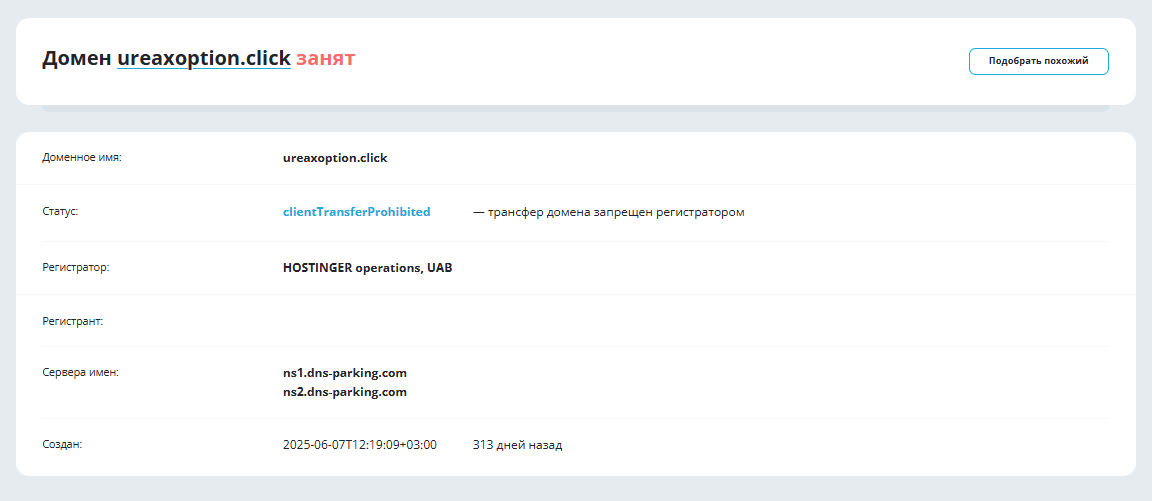 Мы предполагаем, что даже в течение этих нескольких месяцев сервис не существовал, так как обзор подготовлен в апреле 2026 года и домен UreaxOption click используется всего 313 дней. В архиве о нем нет ни единой проиндексированной записи, что говорит о слишком малом наплыве клиентов или появлении площадки только в начале 2026-го.