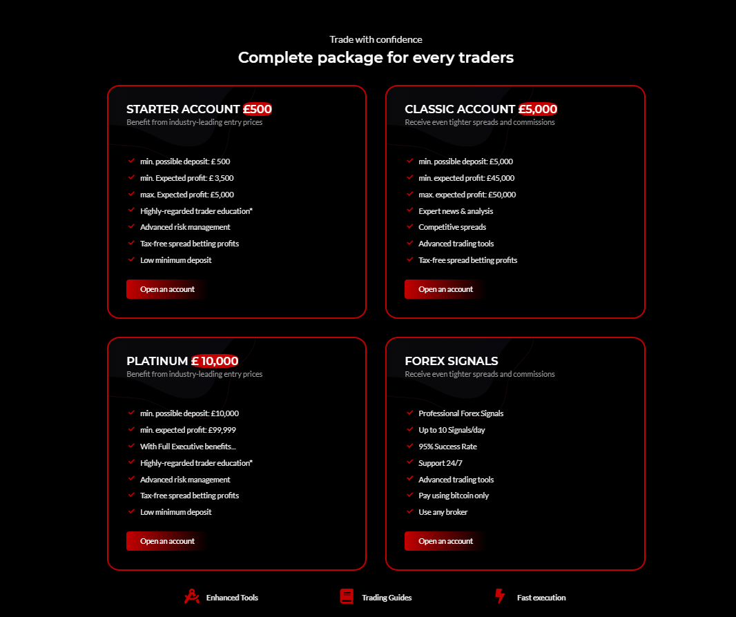 На Ureax Option предлагают трейдинг и инвестиции, реализованные в виде финансовой платформы с возможностью быстрого обучения. Пользователю предлагают выбрать один из тарифов, для которых нужно пополнить депозит на сумму от £500 до £10,000.