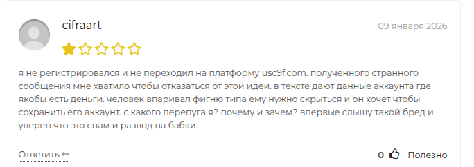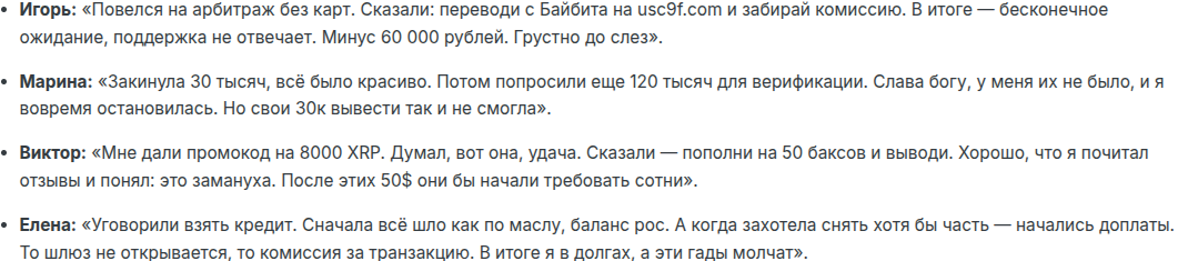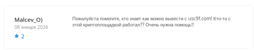 В отзывах о бирже криптовалют Usc9f com бывшие пользователи еще утверждают про скам раскруткой счета. Ее под видом оплаты якобы издержек за вывод средств продвигают разработчики. Итог работы — обнуление счета доверчивого трейдера.