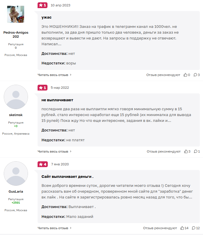 В других же открытых источниках репутация сервиса оставляет желать лучшего. Отзывы о заработке с V Like ru носят выраженный негативный характер. Заказчики пишут, что площадка списывает деньги, но не дает ожидаемого результата. Исполнители жалуются, что так и не получают вознаграждений даже после выполнения всех условий сотрудничества. Техподдержка не решает проблемы ни одной категории клиентов.