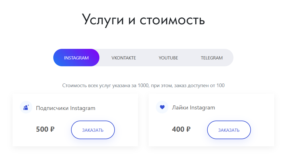 Заработок с V Like возможен в четырех сетях – Инстаграм, Телеграм, Ютуб и ВКонтакте. Стоимость услуг указана за 1 000 единиц. Минимальный заказ доступен от 100 единиц. Цена зависит от выбранной социальной сети или мессенджера. Например, 100 подписчиков в Инстаграм будет стоить ₽500, а 100 лайков здесь же ₽400.