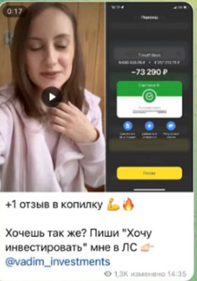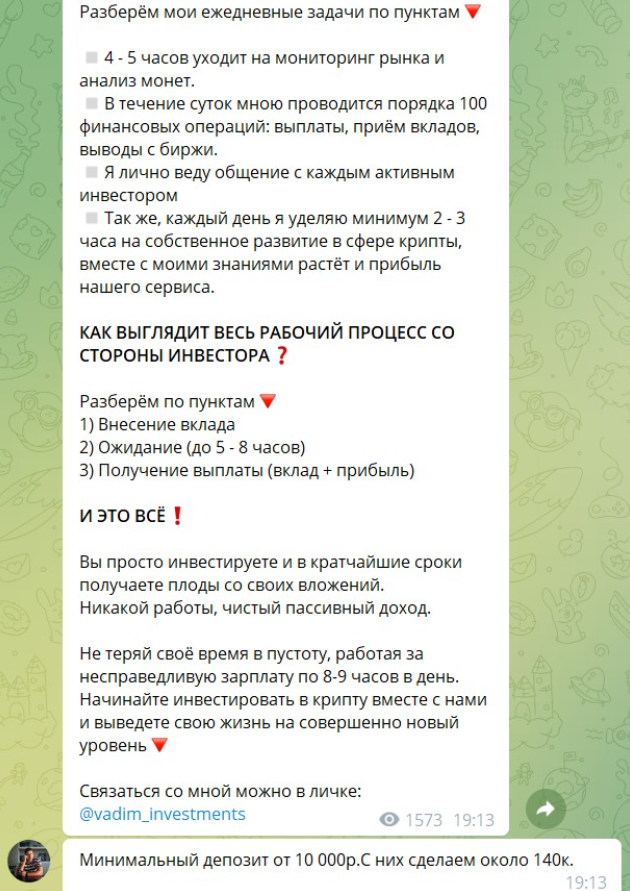 Желающий работать с трейдером должен отправить ему личное сообщение «хочу инвестировать». Затем автор канала передаст счет для оплаты депозита. После оплаты начинается работа и далее остается ждать только выплаты. Естественно, что предлагаемая Вадимом Матвеевым схема выглядит не только просто, но и очень подозрительно. Документального оформления сделки тут нет и все остается только на словах в переписке.