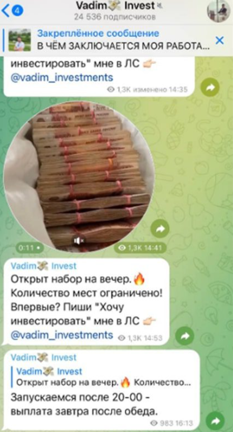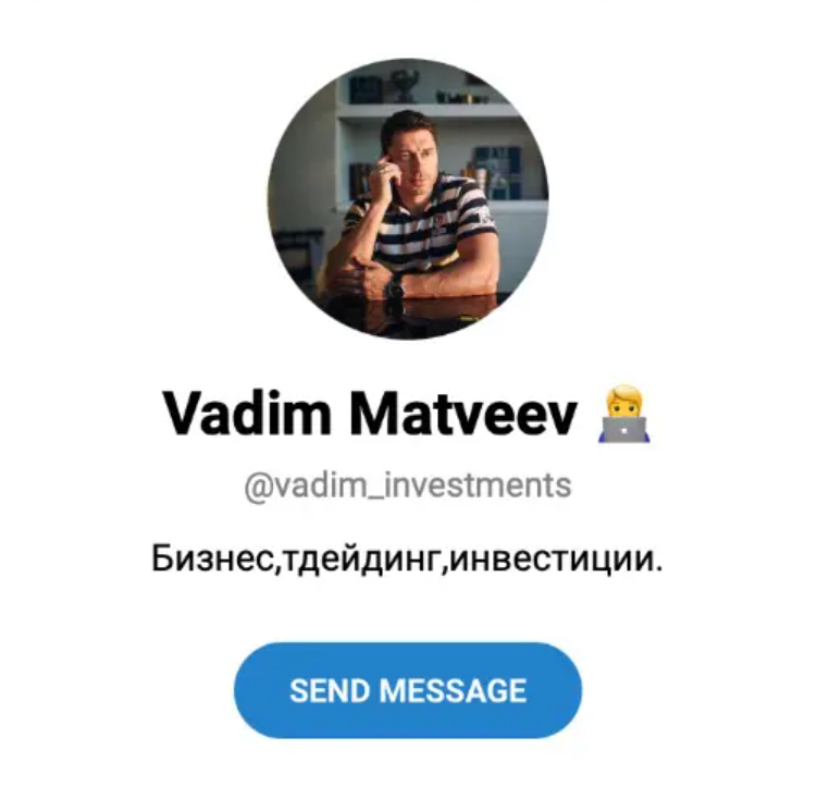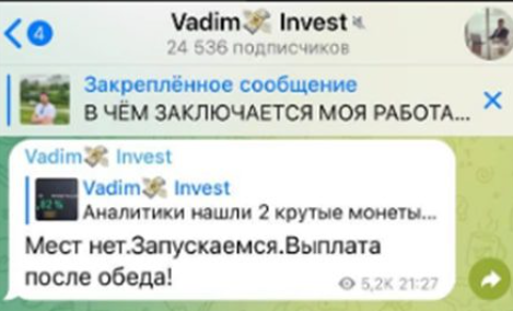 Основная деятельность трейдера развивается в его телеграм-канале Vadim Invest. Для доказательства пользователям своей надежности он регулярно публикует скрины с выплатами партнерам. Сделать инвестицию в дело, которым занимается Вадим Матвеев, может практически каждый человек, у которого даже нет опыта в трейдинге и инвестициях. Главное дождаться сигнала о том, что рынок скоро будет расти и присоединиться к работе.