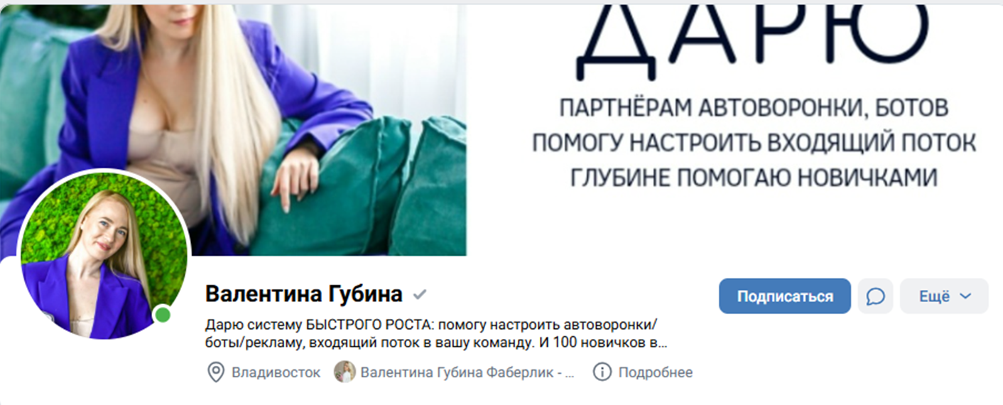 О своей работе Валентина рассказывает в социальных сетях – ВКонтакте и в телеграм-канале. В описании аккаунта женщина утверждает, что дарит уникальную систему быстрого роста и сможет настроить автоворонки, бота продаж, рекламу и поток последователей в команду. Но стоит сразу отметить, что никакими доказательствами эти слова не подкреплены.
