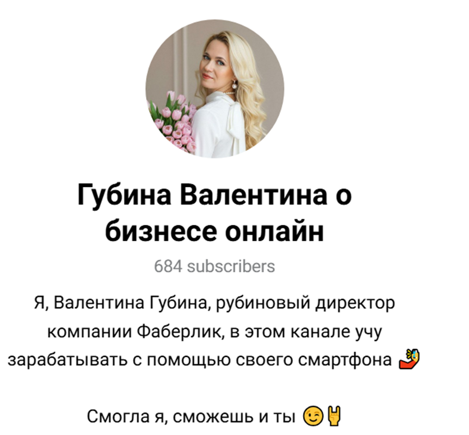 Валентина Губина является рубиновым менеджером довольно известного бренда косметики «Фаберлик». Женщина утверждает, что создала сеть партнеров, месячный оборот которой превышает 1,5 миллиона рублей. На данном этапе она привлекает новых людей в свою команду и утверждает, что можно получать хорошие деньги, работая с телефона.