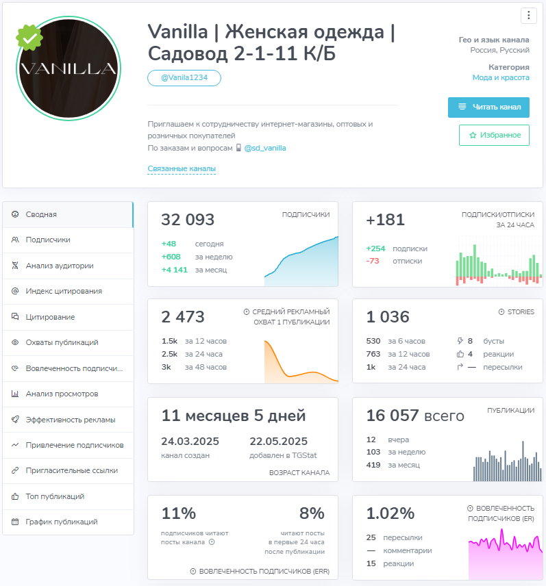 Отзывов от покупателей интернет-магазина в телеграмме «Vanilla Женская Одежда» тоже нет. На сервисе TGStat мы изучили статистику блога и увидели, что тут идет резкий рост аудитории, а площадку читает всего 8%.