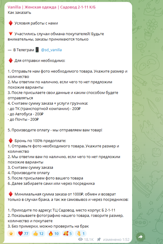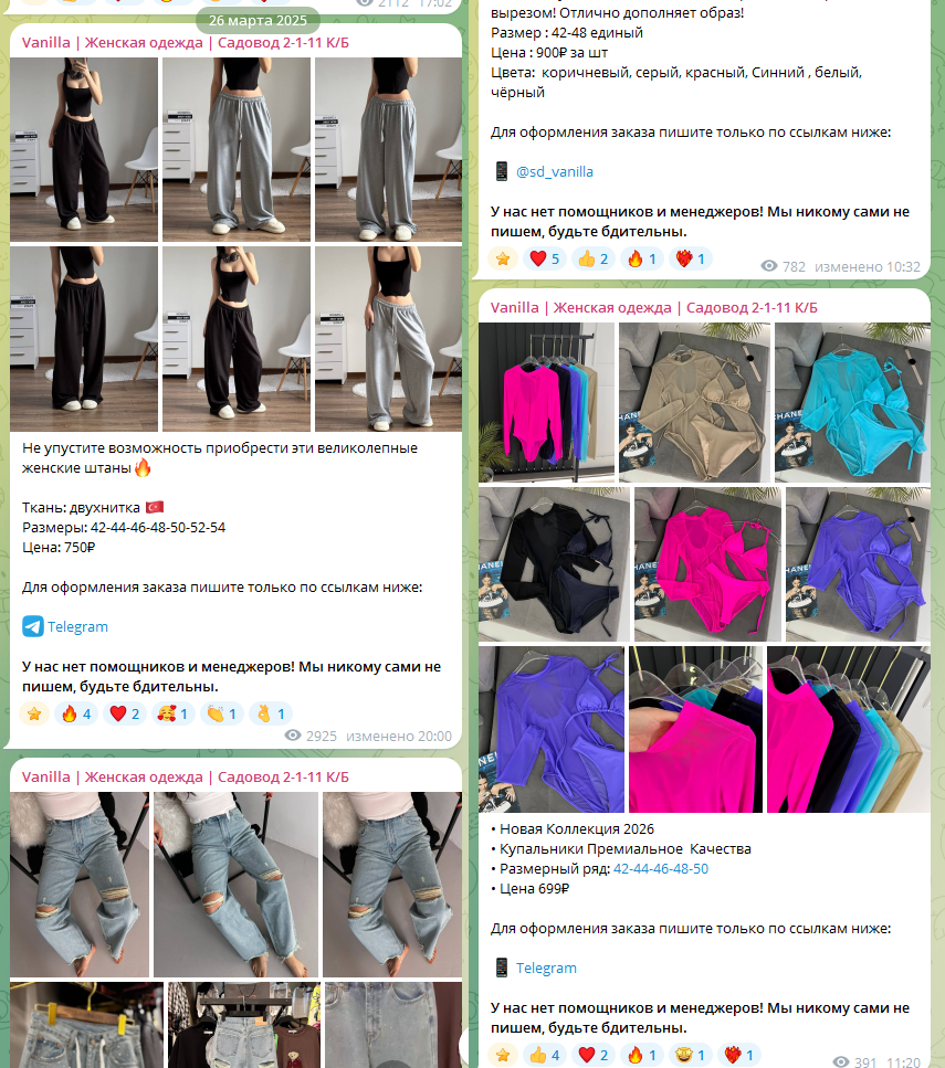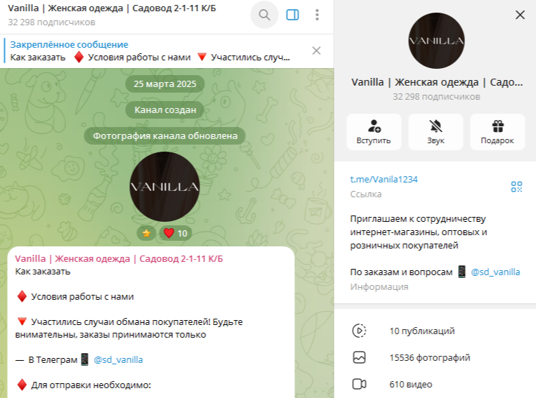 Телеграм-канал «Vanilla Женская Одежда» является интернет-магазином по продаже женской одежды. У авторов проекта есть и офлайн-магазин, находящийся на базе «Садовод». В интернете организация работает почти один год, но сколько он существует на базе – неизвестно.