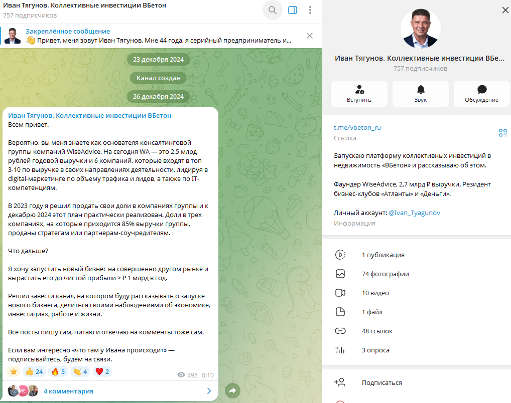 При этом Иван Тягунов, основатель сервиса ВБЕТОН, ведет аккаунты в социальных сетях. Например, у него есть канал в Телеграм, в котором он рассказывает и о себе, и о предложениях платформы.