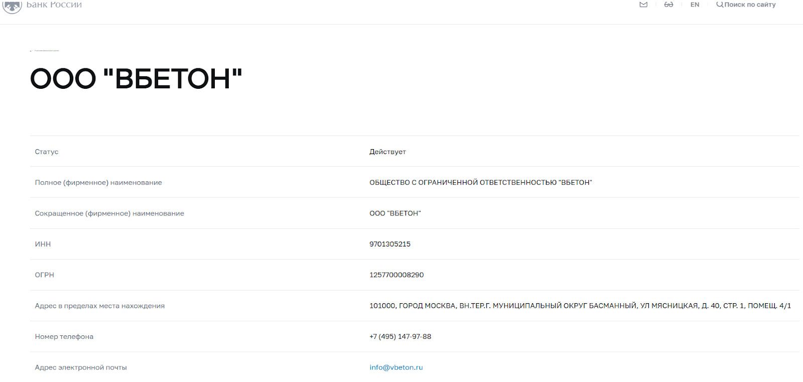 Полноценную работу площадка начала в январе 2025 года. За платформой стоит фирма ООО ВБЕТОН.