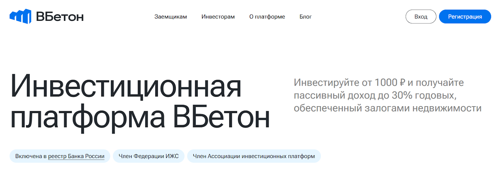 ВБЕТОН – инвестиционная платформа, созданная предпринимателем Иваном Тягуновым. На краудлендинговом сервисе пользователям предлагается инвестировать от 1 тысячи рублей в займы для компаний под залог недвижимости. ВБЕТОН платформа отзывы получить не успела. Мы проверили сервис, узнали больше об инвестициях с площадкой.