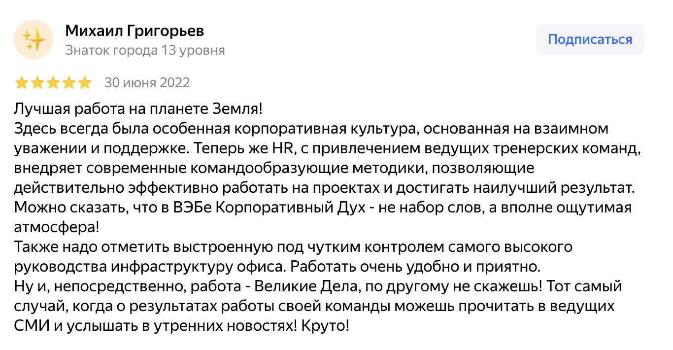 В отзывах сотрудников о Вэб Рф часто фигурируют темы управления, карьерного роста и корпоративной культуры. Критические оценки касаются бюрократических процедур и медленных процессов утверждения, чего не избежать в крупных госкорпорациях. В то же время отмечают и стабильность, и возможности участия в крупных проектах со знакомыми бизнес процессами и реквизитами.