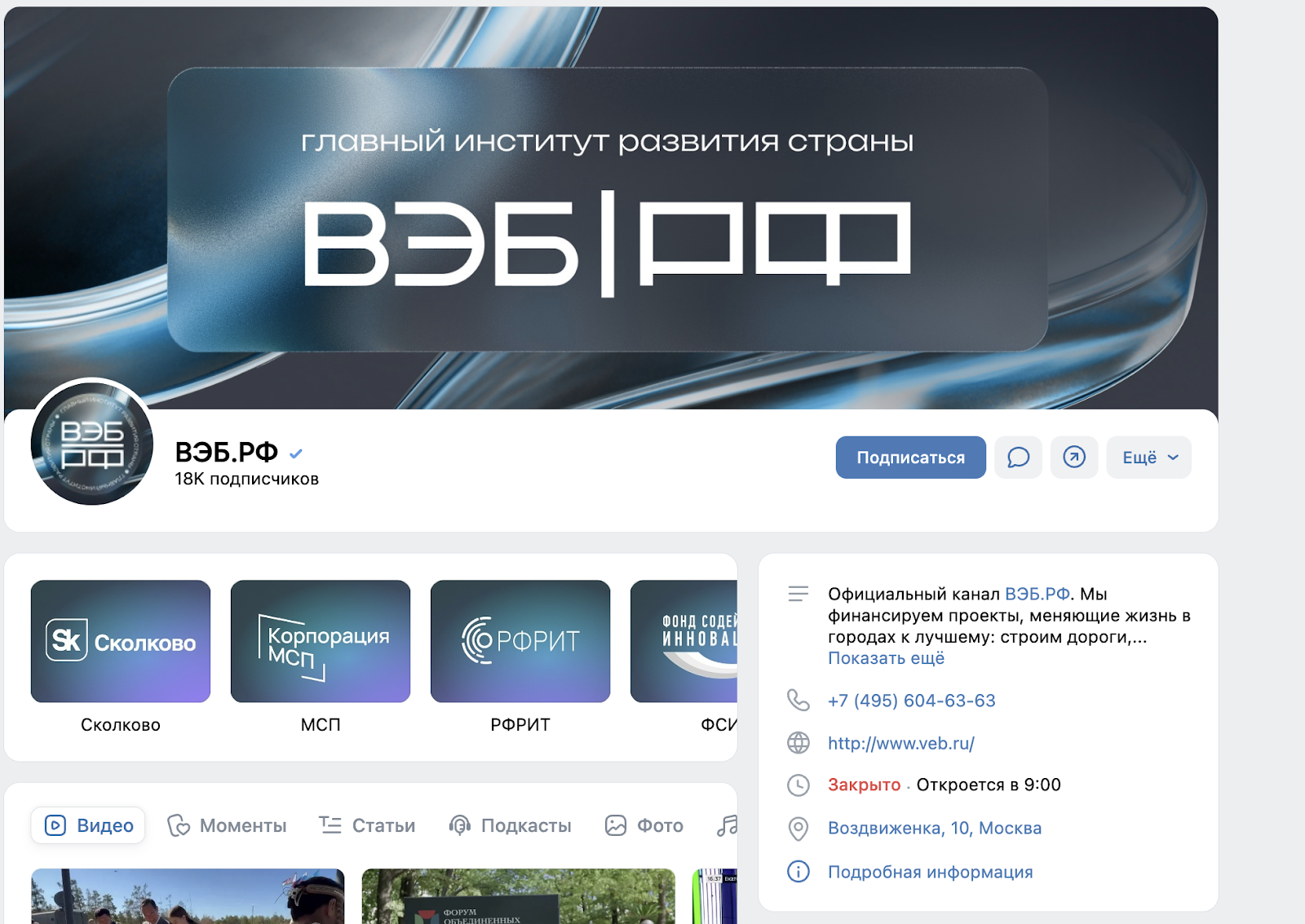 Корпоративные каналы проекта представляют собой основной сайт, канал на Ютуб, аккаунты в ВК и ОК служат главным образом институциональной коммуникацией: отчетность, новости проекта, пресс-релизы и презентации стратегий. Телеграм канал и сопутствующие паблики часто публикуют анонсы и короткие дайджесты по проектам и инициативам. При этом коммуникация рассчитана больше на стейкхолдеров и профильные аудитории, чем на розничных инвесторов.