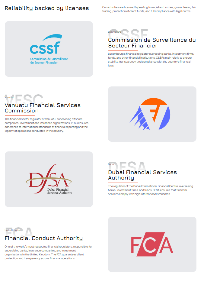 На странице с лицензиями можно увидеть информацию о том, что у брокера их целых 4:
