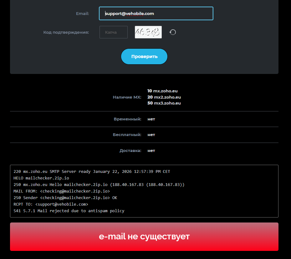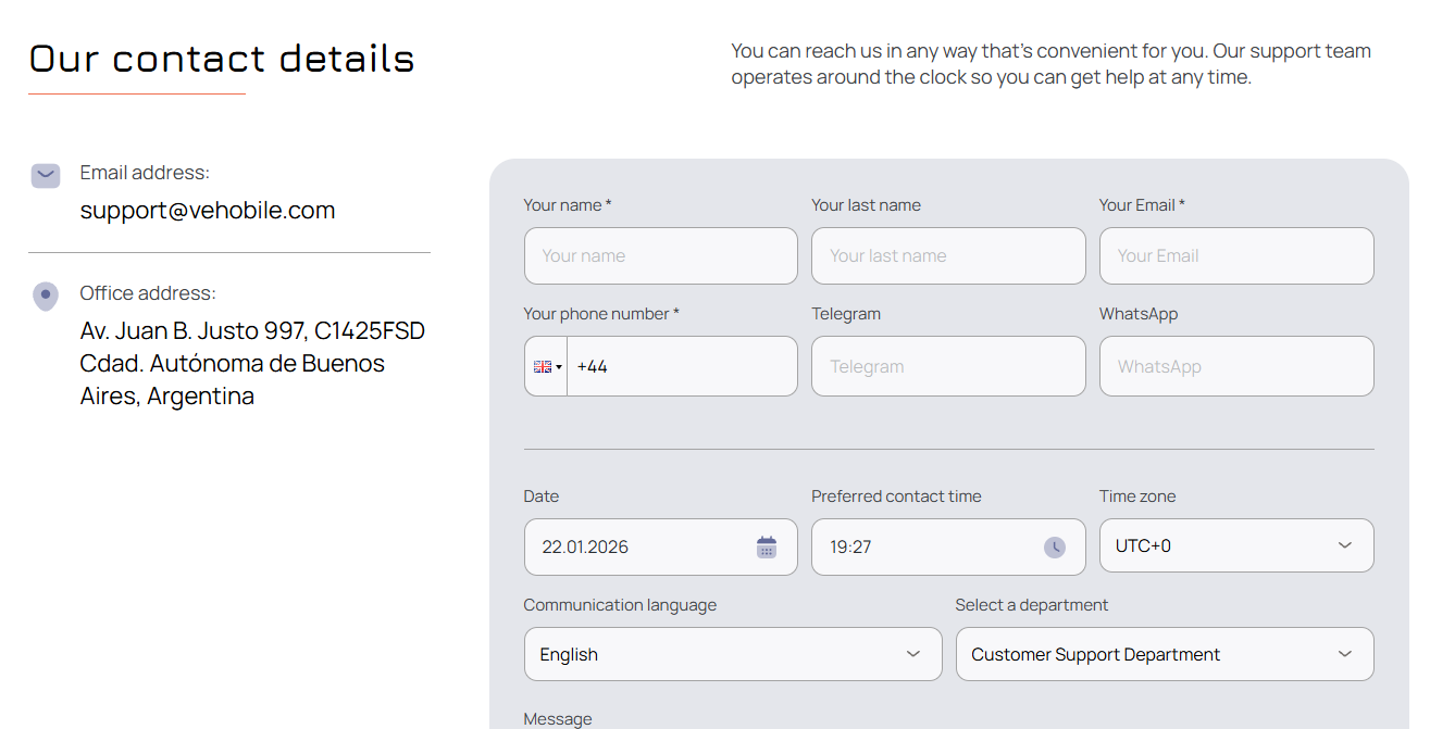По указанному адресу нет такой компании, а email support vehobile com вообще не существует: