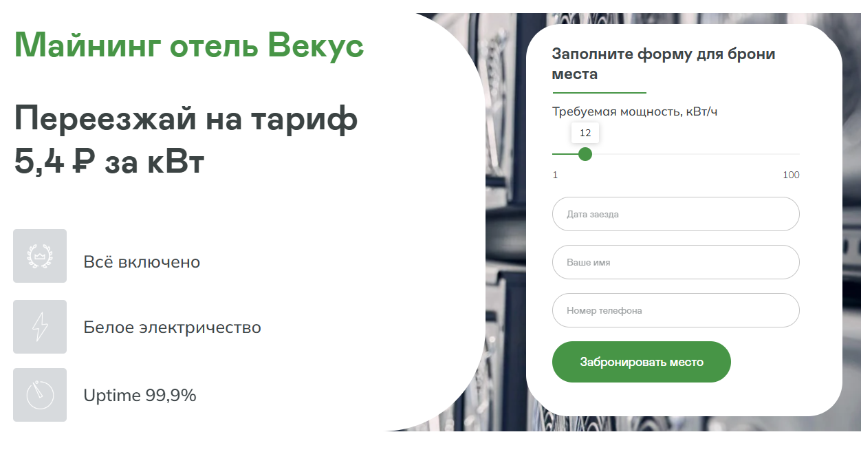 Единственные цифры, которые можно узнать с сайта – стоимость хостинга оборудования для майнинга. Она составляет 5,4 рубля за киловатт энергии.