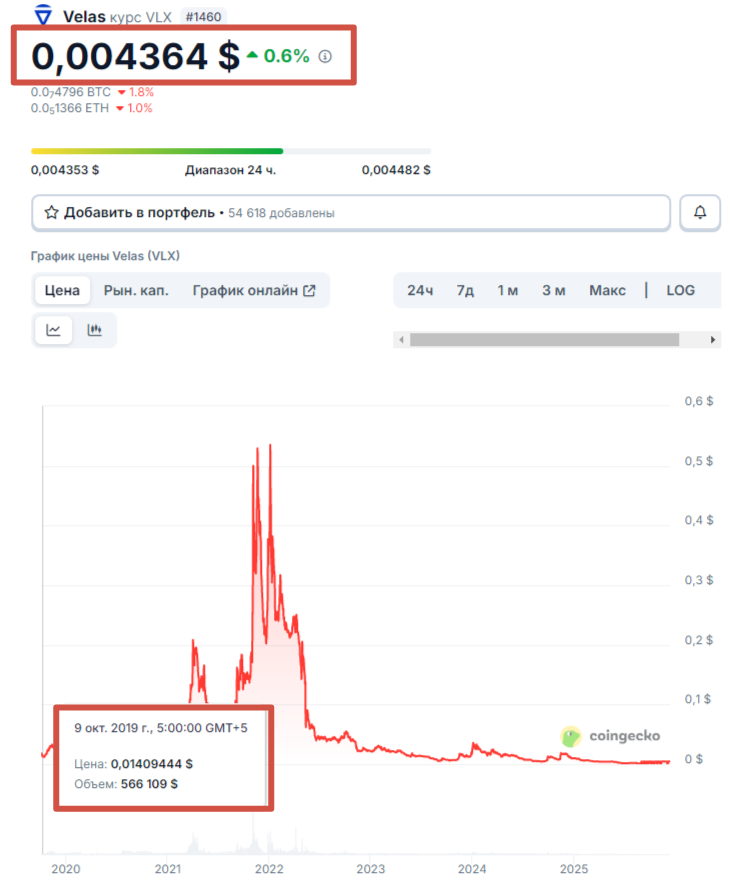 За 5 лет стоимость актива не увеличилась, а даже наоборот, уменьшилась. 9 октября 2019 года монета запустилась по цене 0,014$. На 12 декабря 2025 года она имеет стоимость 0,0043$.