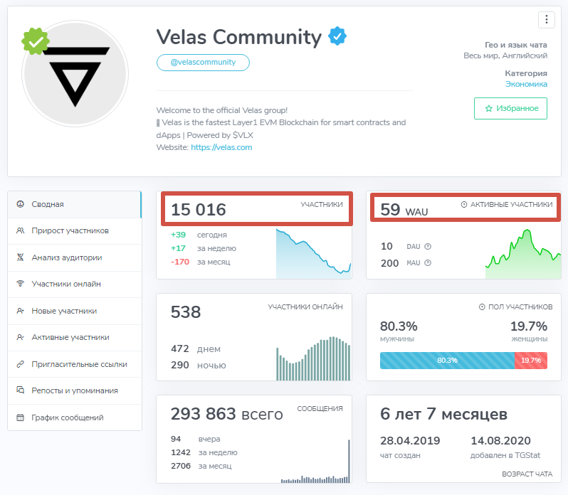 Это настораживает и ставит под сомнение 5-ти летний возраст проекта. Однако мы нашли телеграм-канал проекта Velas Community @ velascommunity и увидели, что ведется он с апреля 2019 года. Странно, что за столько лет источник не смог стать известным и востребованным.