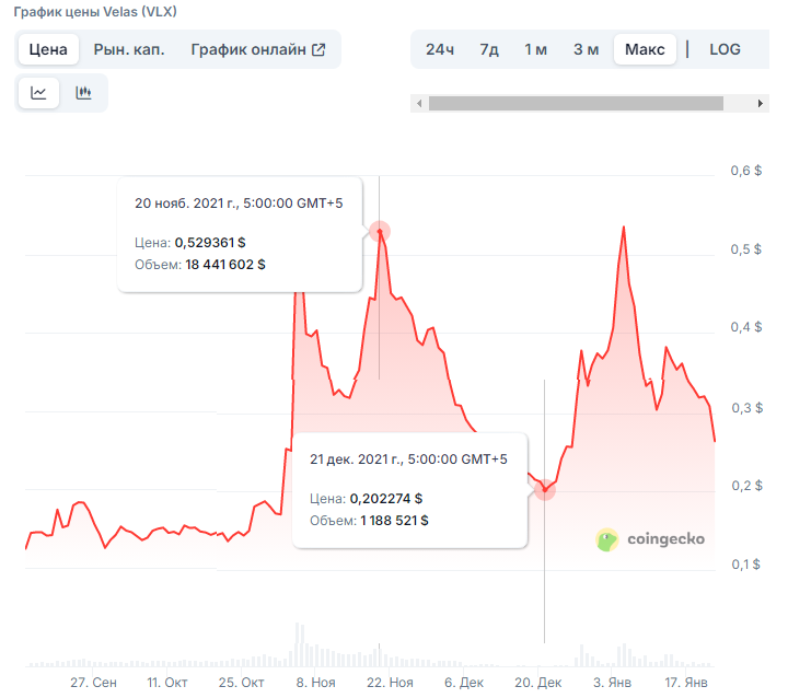 У токена Vlx был резкий рост в сентябре 2021 года. Тогда цена была 0,5293$, в то же время был и резкий спад до 0,2022$, следом вновь рост и уже постепенный спад. С начала 2022 года цена только понижалась и продолжает это делать.