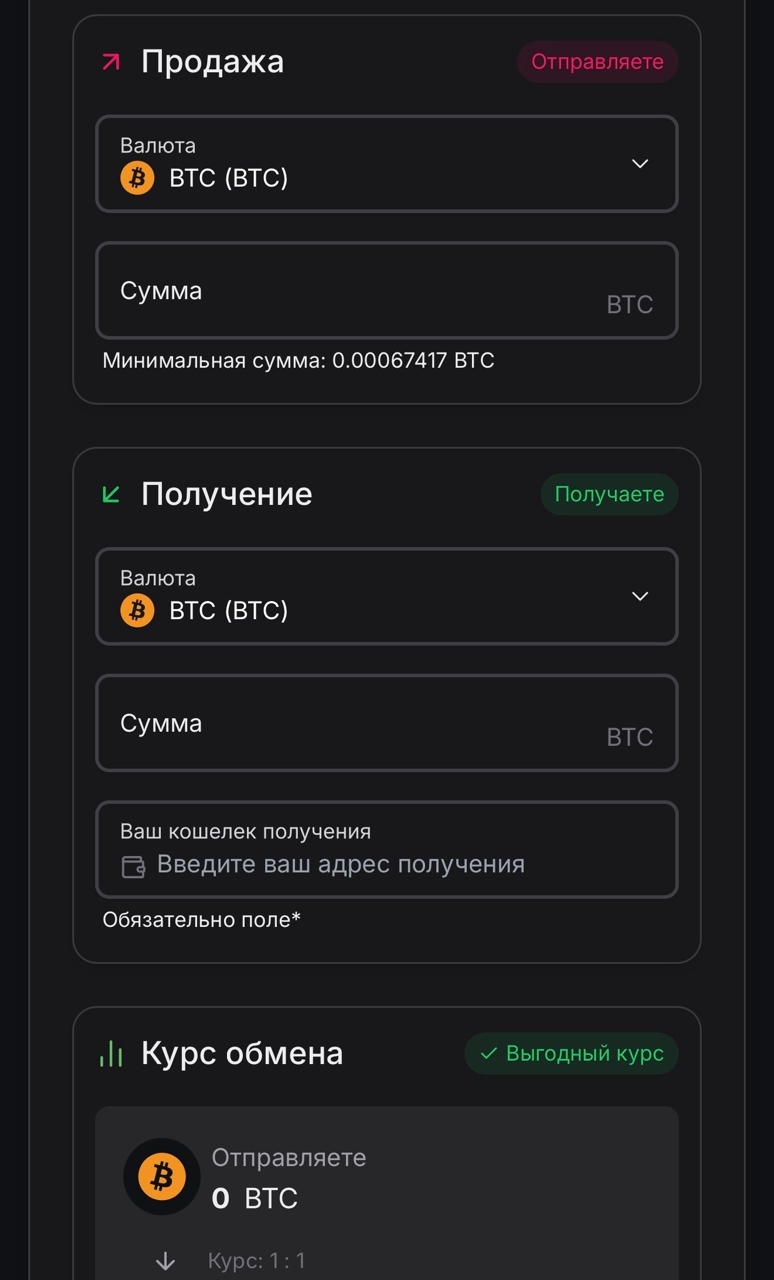 Поле для обмена стандартное – следует выбрать направления обмена, ввести суммы (лимиты по каждой из монет отображаются автоматически), указать адрес зачисления денег и свой номер телефона и электронку.