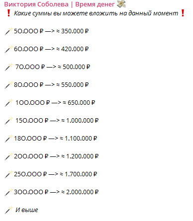 Главная услуга, которую оказывает Виктория, — это «раскрутка депозита». Вложив 50 тыс. рублей, клиент якобы на следующий день получит 350 тыс., 70 тыс. — 500 тыс. Тому, кто переведет ей 300 тыс., Соболева обещает сразу 2 млн. То есть доходность составляет выше 500% в день. Такую прибыль не может дать даже криптовалютный рынок с его высокой волатильностью. Очевидно, что перед нами мошенница, которая обманывает неподготовленных людей.