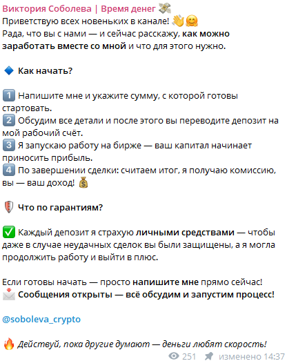 Чтобы «инвестировать», клиент должен написать Соболевой в личные сообщения Телеграм по адресу Soboleva Crypto, а затем перевести средства на ее «рабочий счет». Скорее всего, речь идет о платеже на карту физлица. Это очень опасное действие: такую транзакцию нельзя оспорить даже через процедуру чарджбека.