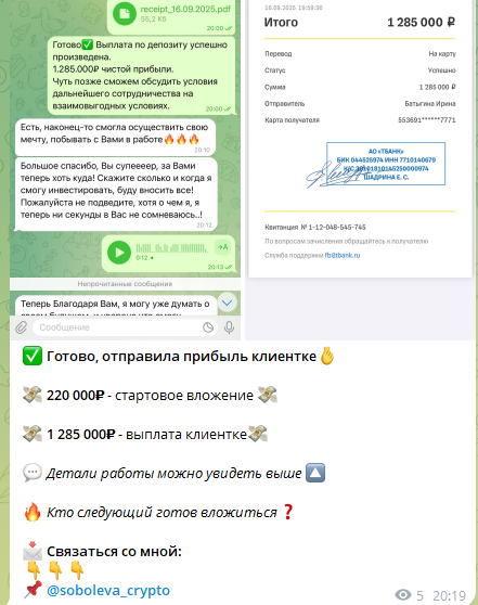 Канал регулярно публикует «доказательства» того, что клиенты получают свои деньги с большой прибылью. Например, Виктория якобы отправила 1,28 млн рублей подписчику, который накануне вложил 220 тыс. Однако такие скриншоты легко подделать, поэтому они не внушают никакого доверия.
