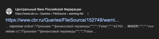 - ЦБ РФ внес vipminer online в черный список.