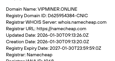 С целью узнать о том, сколько времени работает платформа, мы обратились к WHOIS. Полученные из него данные показали, что домен vipminer online был зарегистрирован лишь 30 января 2026-го года.