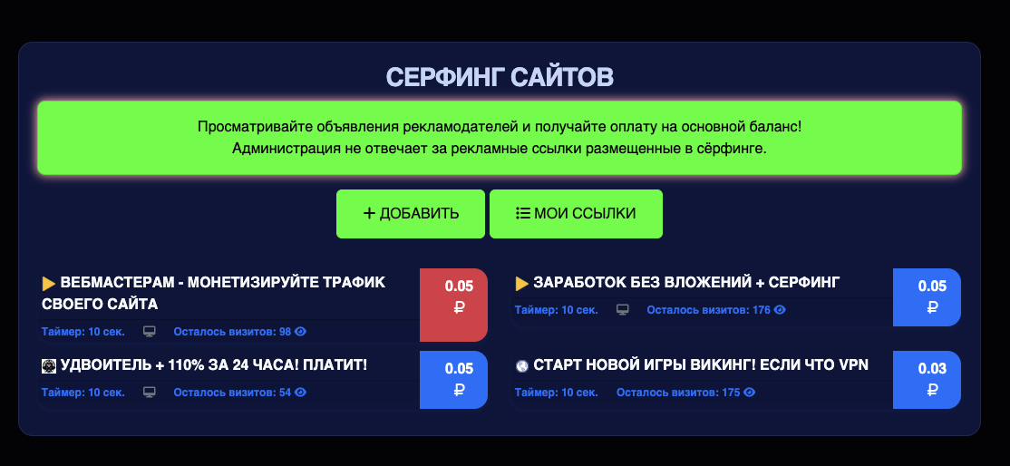 В личном кабинете присутствуют инструменты, при помощи которых можно заработать без вложений. Пользователям предлагают посещать сайты партнеров. За каждый переход на ресурс обещают выплачивать по 3-5 копеек.
