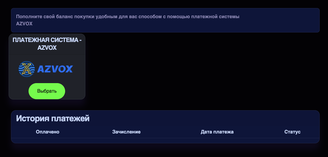 С целью узнать о сервисе VipminerOnline побольше мы на нем зарегистрировались. Первое, что бросилось в глаза — это то, что внести деньги на баланс возможно только через малоизвестную платежную систему Azvox.