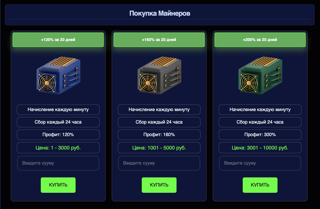 Пользователям для заработка предлагают покупать «майнеры». За счет этого они якобы могут получать доход 120-200% от вложений за 20 дней. Это еще один показатель того, что VIPMiner является обманом. Настоящий майнинг и близко не дает такой огромной прибыли.