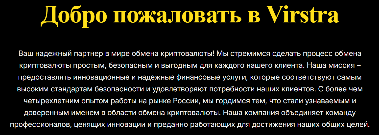 Обменник Virstra представляется как надежный партнер в сфере обмена криптотокенов. Здесь обещают инновационные решения, обладающие высоким уровнем надежности. Говорится, что компания работает в РФ более 4 лет. Но при этом упоминаний о ней нет. Сервис отсутствует на проверенных агрегаторах и обменниках, что для этой сферы деятельности выглядит странно. В компании работают специалисты, которые внедряют инновации. В то же время, сайт выглядит очень шаблонно, заимствует многие элементы с ресурсов мошенников. Это касается также наполнения, логотипов и структуры.