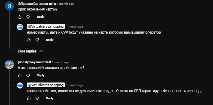 О сроках действия карты ничего не говорится. Многие условия работы с сервисом можно узнать только через общение с оператором в Телеграмм. На YouTube-канале Virtualcards Shopping авторы проекта публикуют обучающие ролики о том, как оплатить заграничные услуги и сервисы из России.